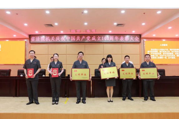 为隆重庆祝中国共产党成立100周年,表彰先进,激励队伍,6月25日上午,省法院召开省法院机关庆祝中国共产党成立100周年表彰大会。